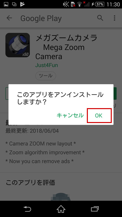 「このアプリをアンインストールしますか?」と表示されるので、OKを押します。